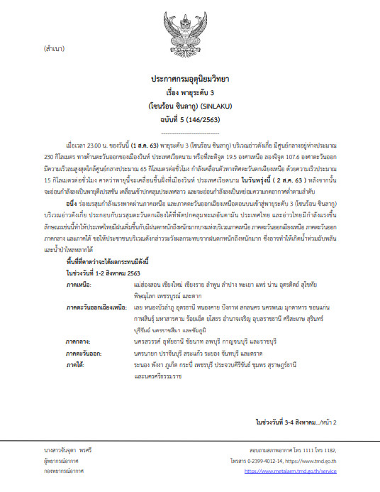 ประกาศกรมอุตุนิยมวิทยา "พายุระดับ 3 (โซนร้อน ซินลากู) (SINLAKU)" ฉบับที่ 5 ลงวันที่ 02 สิงหาคม 2563