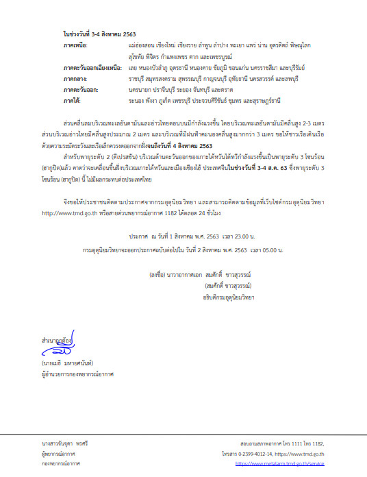 ประกาศ ณ วันที่ 1 สิงหาคม พ.ศ. 2563 เวลา 23.00 น. กรมอุตุนิยมวิทยาจะออกประกาศฉบับต่อไปใน วันที่ 2 สิงหาคม พ.ศ. 2563 เวลา 05.00 น.